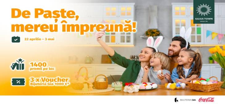 Iulius Town Timișoara va invita sa fiti „De Paște, mereu împreună!”. Evenimentul aduce cadouri pentru toată familia și premii zilnice, iar cei mai norocoși pot câștiga vouchere de 1.000 de euro la Bijuteria Gia.