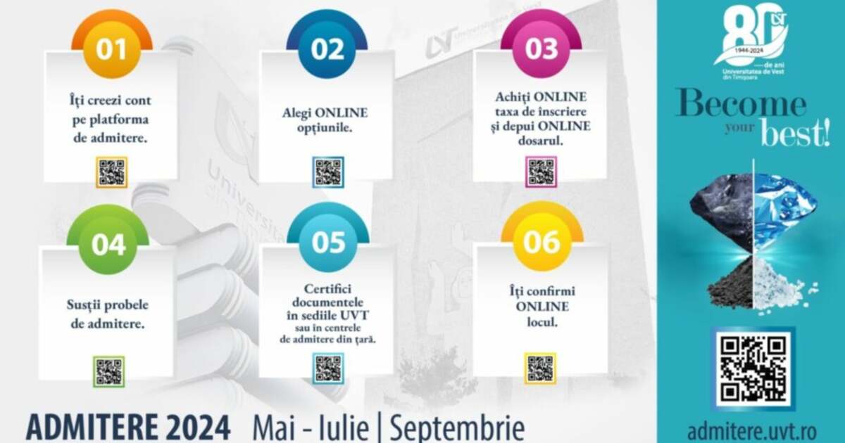 Toate informațiile referitoare la admitere, programele de studii și oportunitățile oferite de UVT sunt disponibile pe site-ul dedicat. Candidații sunt încurajați să înceapă procesul de înscriere online pentru a deveni parte a acestei prestigioase universități.