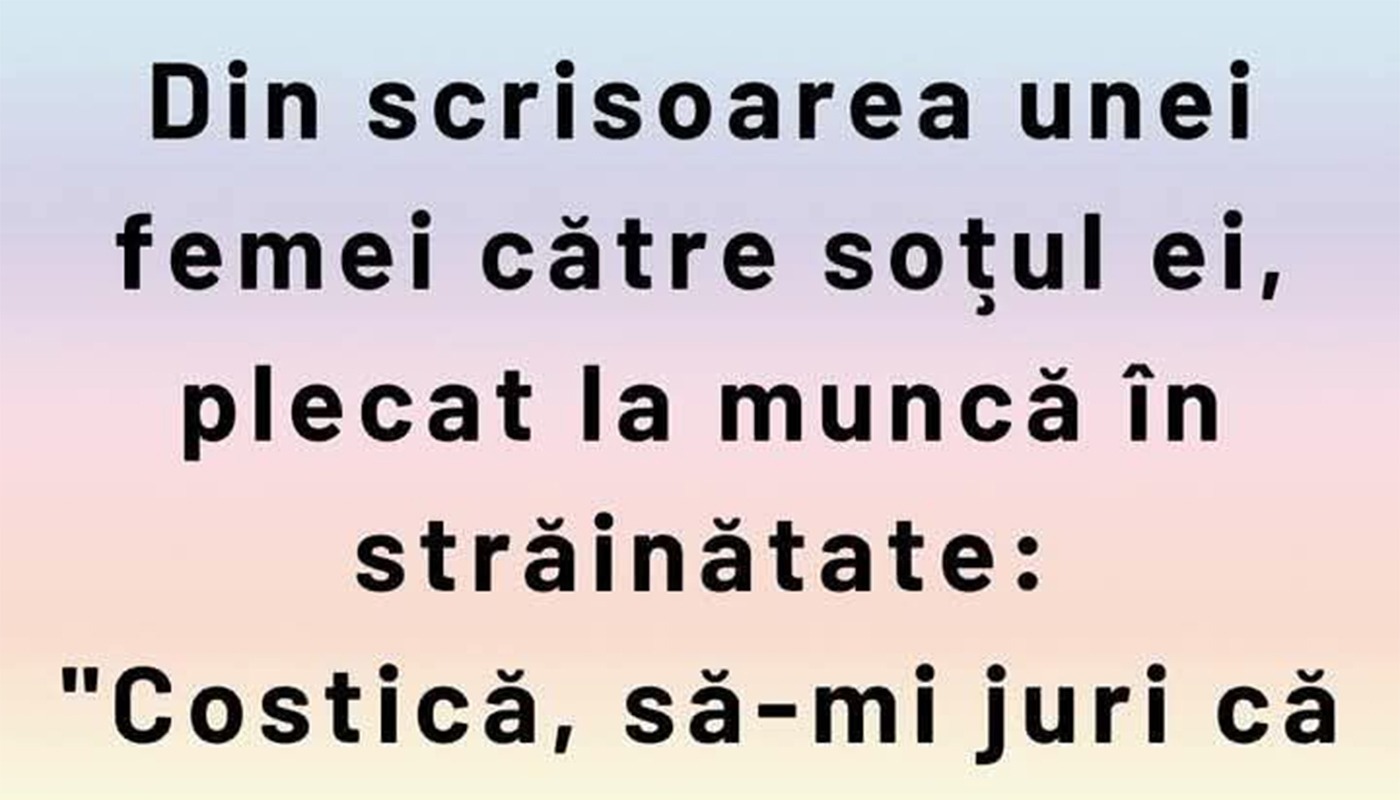 Din scisoarea unei femei către soțul ei, plecat la muncă în străinătate: „Costică, să-mi juri că atunci când ieși în oraș o să ieși numai cu bărbați! Uite, și eu jur la fel…”